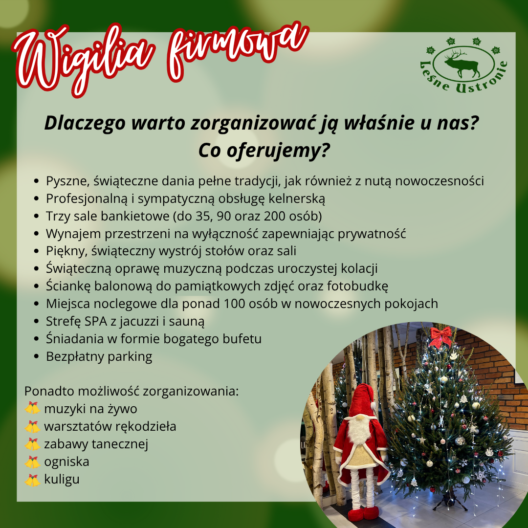 Menu dostosowujemy do potrzeb klienta. Organizujemy konferencje, spotkania integracyjne, szkolenia. W nowoczesnej, klimatyzowanej sali konferencyjnej można się wymieniać spostrzeżeniami, pogłębiać wiedzę. Po wykładach, szkoleniach można spacerować, odpoczywać na łonie natury. Leśne Ustronie to bogata oferta dla firm, idealne miejsce dla osób łączących odpoczynek z pracą.